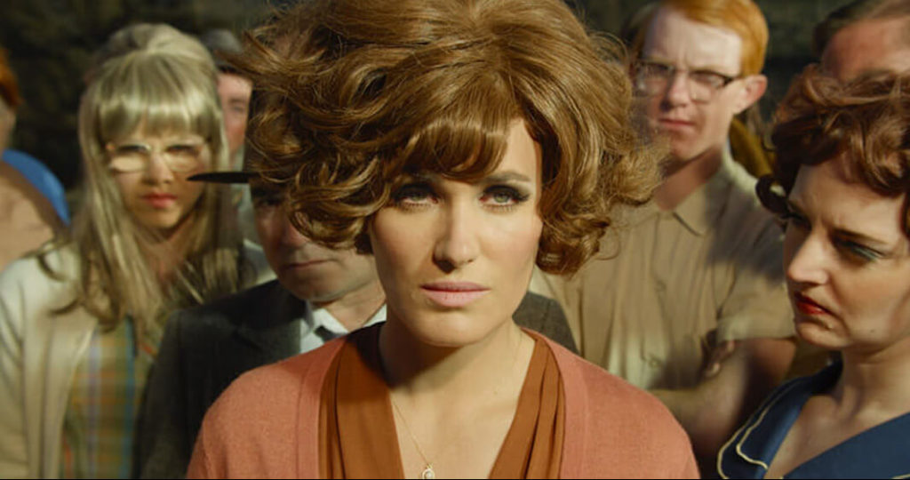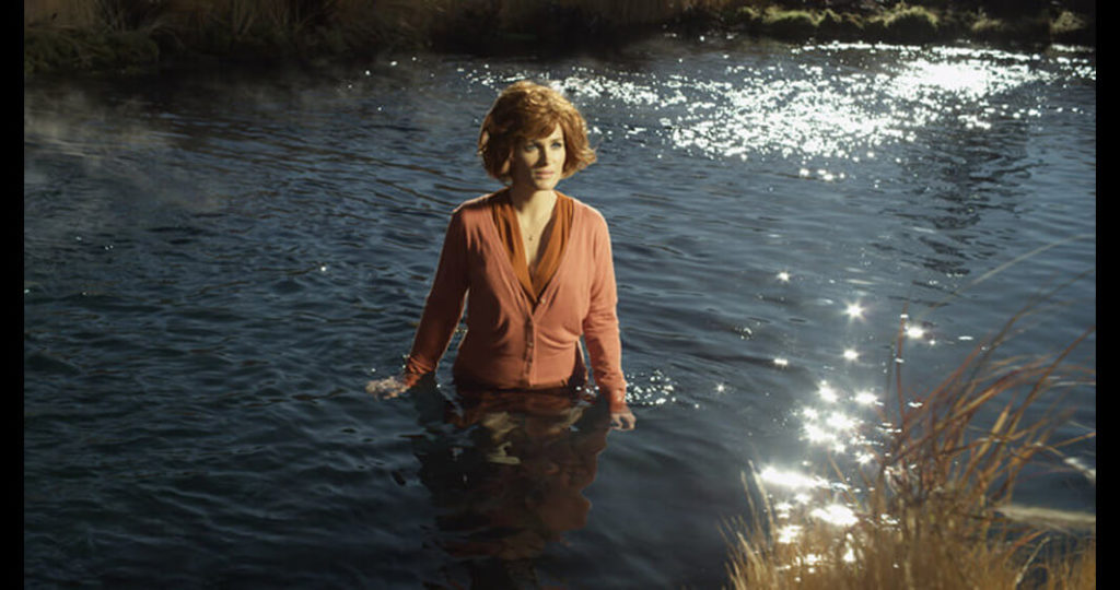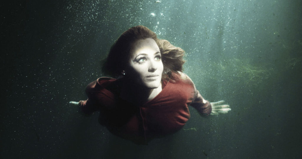 The lush video’s narrative begins with narration describing a mother’s ecstasy in labor, abruptly cutting to a speeding train headed straight toward a woman, her eyes fluttering in anticipation of the impact. The crash sends her flying backward into a pond, where she indulgently swims until surfacing to face a judgmental crowd. Lambasted by each character’s glare, she eventually reaches her “love interest” standing behind the crowd alone. She collapses to the ground as the crowd disappears and the train conductor rushes to her limp body.